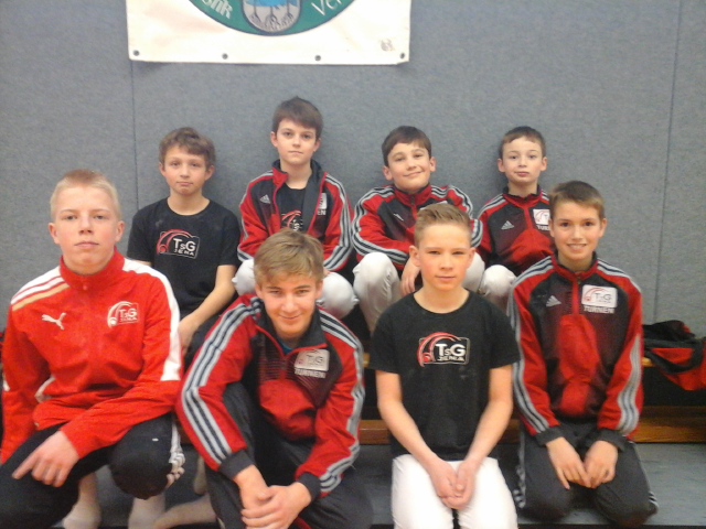Bester Turner der TsG war an diesem Tag Fynn Barthel. Er ging an 5 von 6 Geräten an den Start und wurde in der inoffiziellen Einzelwertung Sechster. Jaron Panepinto überzeugte am Boden, Barren und den Ringen, wo er immer mehr als 11 Punkte erturnte. An den Ringen verhalfen er und Fynn Barthel mit den Tageshöchstnoten (11,20 und 10,90) an diesem Gerät der TsG zum Tagessieg. Es war das erste und bisher letzte Gerät was die Turntalentschule aus Erfurt abgegeben hatte. Doch die Jungen um Kapitän Björn Pölzing konnten den Abstand auf den erneuten Sieger aus Erfurt verkürzen. Finn Herbst erwies sich wieder einmal als solider Startturner und brachte wie auch Tobias Kiehntopf wichtige Punkte am Pauschenpferd ein. Florian Kindler gab ein hervorragendes Debüt am Boden. Benny Winkel freute sich über seinen gelungen Überschlag am Sprungtisch, für den er sehr gute 10,20 Punkte erhielt. Luka Deuschle stellte sich erstmals dem Königsgerät Reck. Am Ende konnte er stolz auf seine Leistungen an dem für ihn ungeliebten Gerät sein. Platz vier ging erneut an den Nachwuchs des HSV Weimar. Für 6 der 8 Turner geht es am kommenden Samstag in Jena um den Titel Ostthüringer Meister in der AK 12/13.