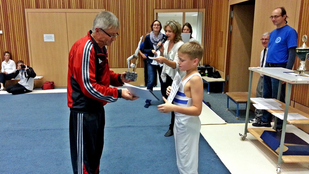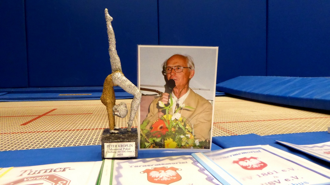 Nach der Schweigeminute zum Wettkampfstart wurde der Pokal in Cottbus von Peter Vorberg an die jüngste Turngruppe vor Ort überreicht.  Peter hat lange Jahre mit Peter Kröplin zusammen geturnt, ihn wirklich lange gekannt und schätzt ihn sehr. Außerdem ist er den Teilnehmern des Turnermemos in Cottbus sehr gut bekannt., hat er doch von uns die meisten Teilnahmejahre (lückenlos seit 30 Jahren). Natürlich gedenkt er auch die nächsten vielen Jahre dorthin zu fahren.