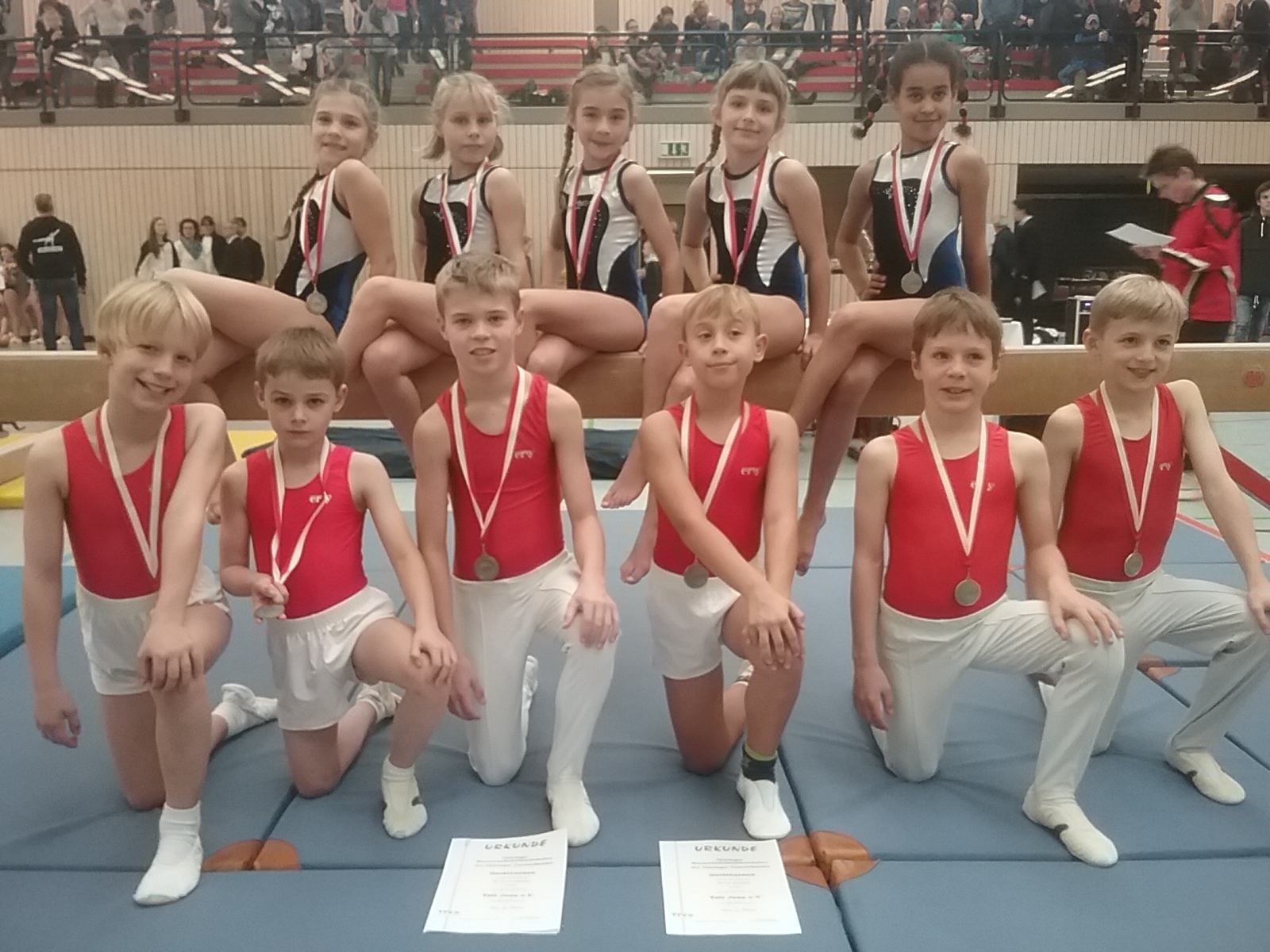 Lynn Bendel, Alma Heylik, Maja Klinge, Lotta Neumeister und Elpida Schaaf mussten im Starterfeld der 8 Mannschaften nur den dominierenden Turnerinnen aus Gera den Vortritt lassen. Während bei den Mädchen 5 Turnerinnen eine Mannschaft bilden, sind es bei den Jungen nur 4 Turner. Leider verletzte sich Clemens Ritzerfeld kurzfristig, so dass die übrigen 3 Turner ohne Streichwertung an den Geräten auskommen mussten. Am Ende gelang Lennox Meier, Julian Kindler und Felix Jurkschat dennoch ebenfalls der Sprung auf Platz zwei, deutlich hinter der Turntalentschule Erfurt und knapp vor den Turnern aus Gotha.