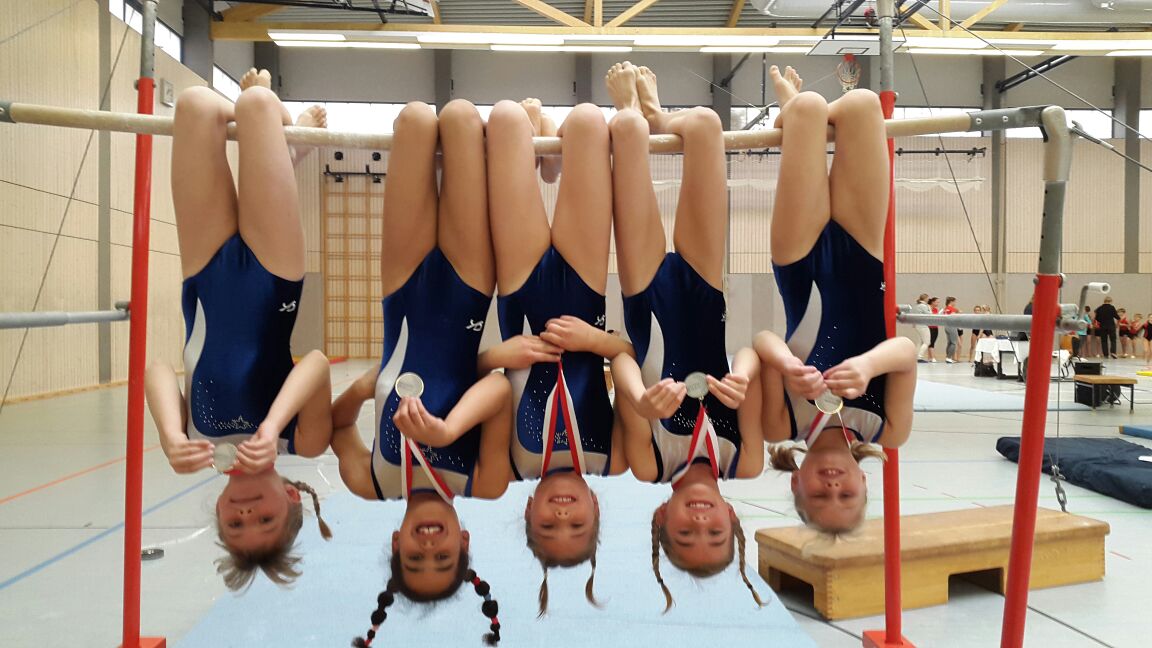 v.l.n.r Maja, Alma, Elpida, Lotta und Lynn stehen Kopf vor Freude über Silber