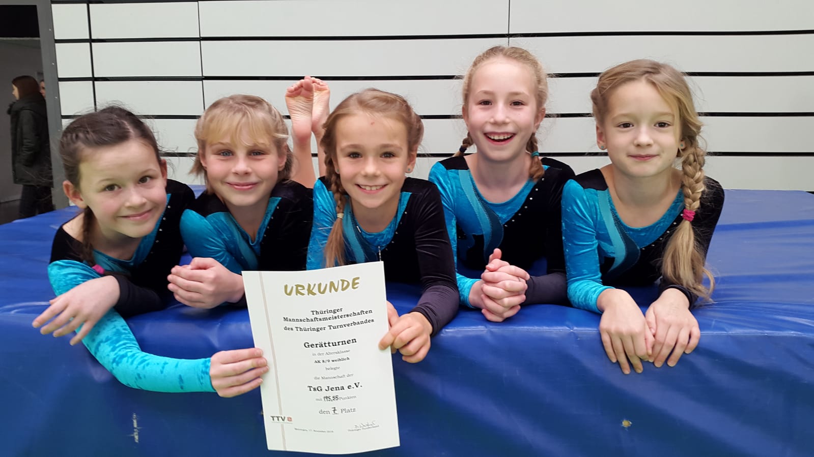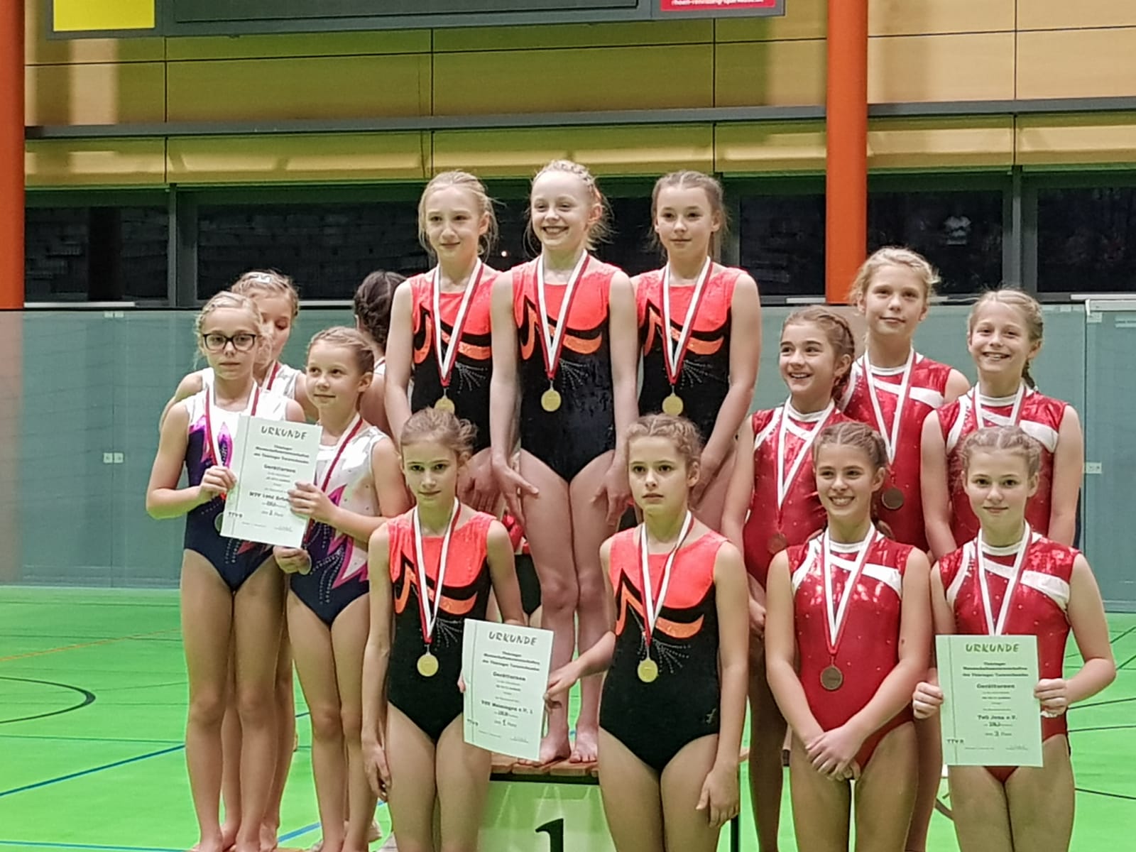 Bei den Jungen der AK 10/11 hatte man leider keine Mannschaft am Start. Dafür sorgten die Jungen der AK 8/9 für eine goldene Überraschung. Blickte man auf die Ergebnisse der Landeseinzelmeisterschaften war das Team aus Jena klarer Favorit. „Man muss aber erste einmal fehlerfrei durchkommen“, bremste Trainer Falk Seliger, der zudem auf den 5. im Einzel Felix Jurkschat verzichten musste. An den Geräten Boden, Sprung, Barren und Reck turnten Clemens Ritzerfeld, Julian Kindler, Max Günther und Jonas Diegel ohne Fehler und siegten vor dem SV Schwarza. „Knapp, aber vierdient“, so Seliger. Und auch die 2.Mannschaft sorgte mit Platz 6 von 8 Teams für eine Überraschung. Hermann Matusevic, Oskar Schneider, Ole Nitzsche und der erst siebenjährige Alfons Schreiber rundeten das optimale Abschneiden der TsG Jungs ab.