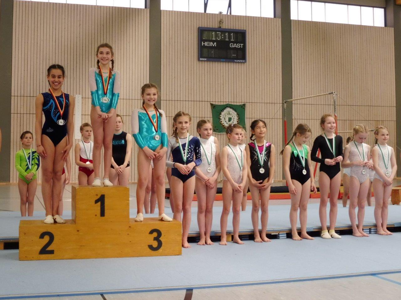 Die „Kleinste“ aus Jena, Lene Nürnberger, Siegerin in der Ak6/7 durften den großen Siegerpokal stellvertretend entgegen nehmen. Aber eigentlich hätten es auch Yael Godmann (AK8/9), Lotta Kästner (AK10/11) oder Froja Oßwald (Ak12/13) sein können, waren sie doch auch alle Gewinnerinnen ihrer Altersklasse. Aber auch die Silber- und die Bronzemedaillen gingen zu 99% an die Turnerinnen der Saalestadt. In der Ak6/7 Silber an Elisa Müller, Bronze an Clara Bungartz, in der Ak8/9 erturnte sich Fenja Pester Silber und Bronze Paula Fleischer sowie in der Ak10/11 Alma Hejlik den 2. und Elpida Schaaf den 3. Platz. Einzig in der Ak12/13 konnte sich Isabell Scholz aus Kimderode zwischen die Jenaerinnen turnen und wurde mit Silber belohnt. Bronze ging an Jana Schmidt.