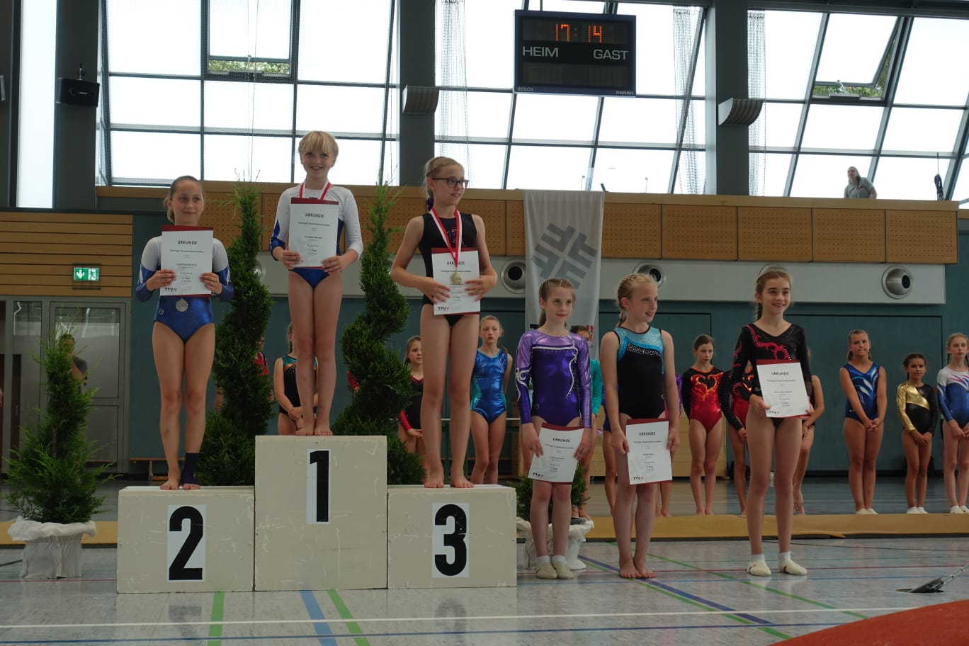 "Das gabe es noch nie in unserer Vereinsgeschichte - eine Landeseinzelmeisterin in einer Kindeklasse", berichtet Katja Grün (Kinder- und Jugenwartin im weiblichen Bereich) stolz. Welch tolle Arbeit die Trainerinnen in dieser Altersklasse leisten, zeigt sich auch darin, dass sich insgesamt 9 Mädchen für den Wettkampf qualifizieren konnten. Fenja Pester und Varvara Krashneva erturnen sich die Plätze 4 und 6 und dürfen somit bei der Siegerehrung mit nach vorne: