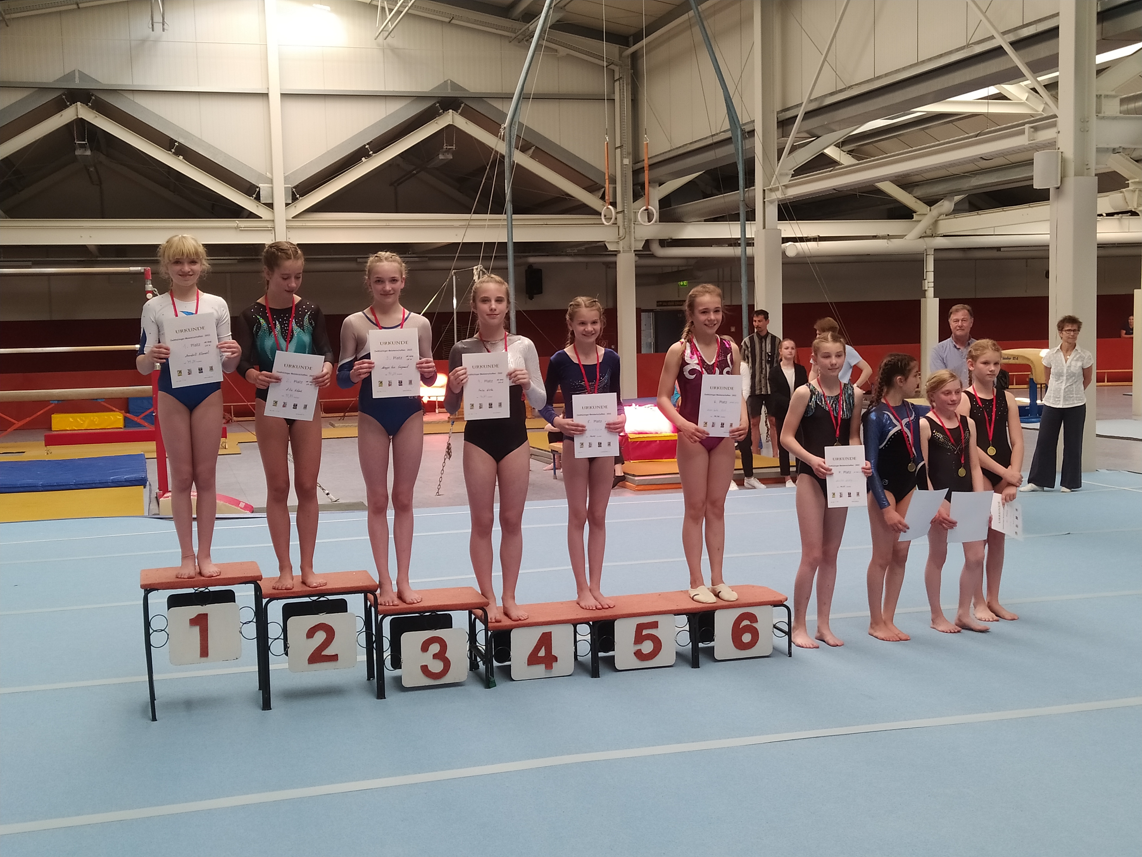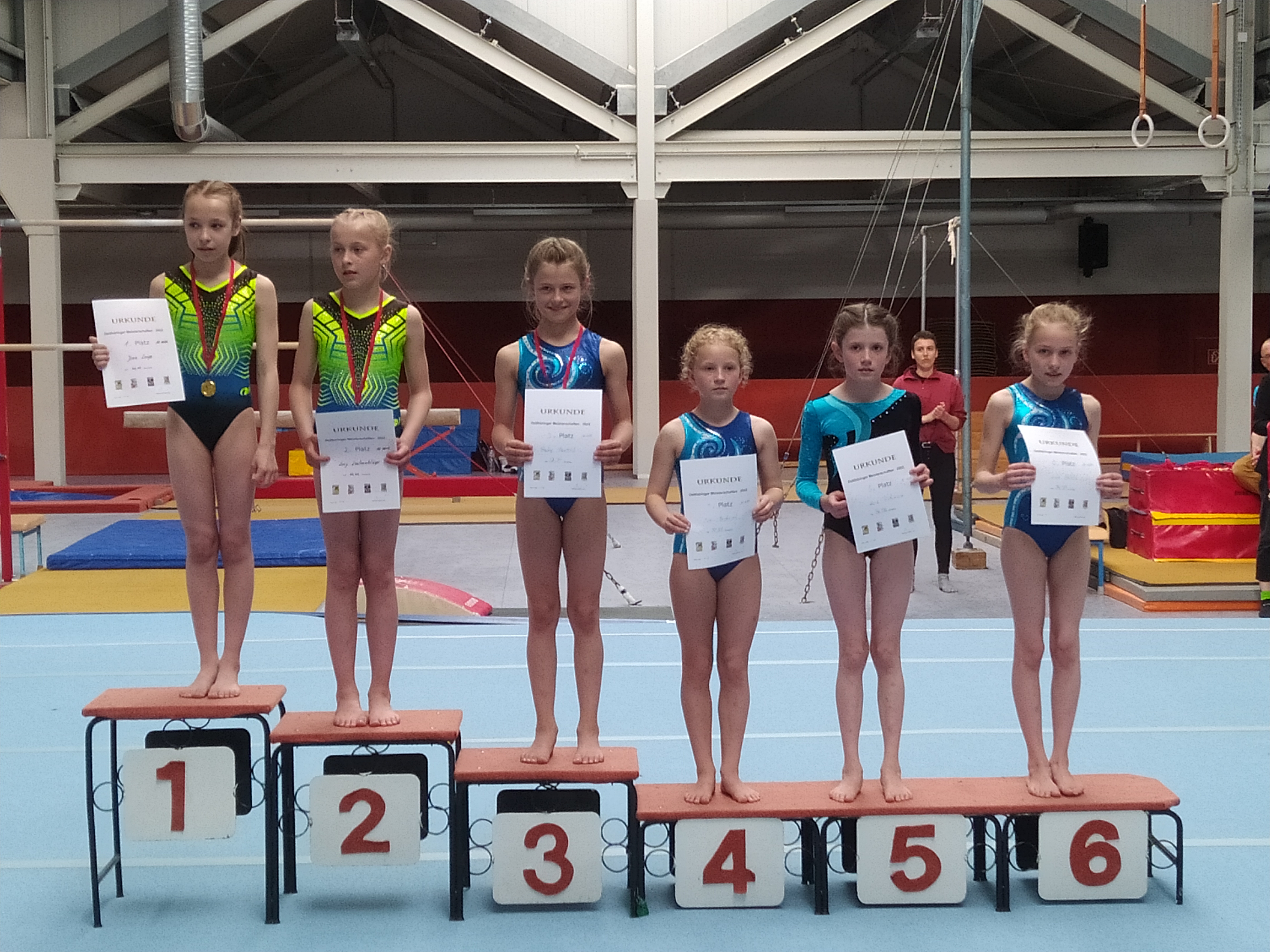 Der Jubel war groß, als Juno Miethke als Siegerin ausgerufen wurde (53,75 Punkte), Charlotte Fäller kam gemeinsam mit einer Geraer Turnerin auf Platz 2 (52,82 Punkte) und Carla Worsch belegte mit minimalstem Abstand den 4. Platz (52,78 Punkte). Auf die weitere Plätze kamen: Merle Laborge (6. Platz), Melina Vollmer (8. Platz) und Pauline Götz (10. Platz), Judith Naumann (12. Platz), Martha Bischofsberger (13. Platz), Wanda Leser (15. Platz), Valeria Düring (17. Platz), Rosalie Blei (18. Platz) und Jasmin Linke (19. Platz).